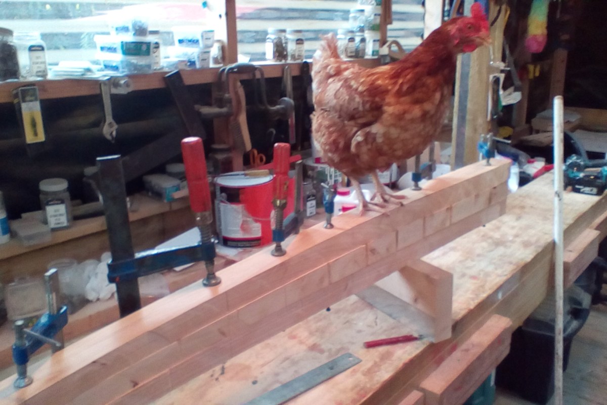 When we went to visit grandchildren in Portugal a couple of years ago, we needed to find someone to take care of the chickens. Brynn’s friend stated she could do it, but it had to be under controlled circumstances where she just accessed the eggs from the laying box and didn’t have to be in contact with the chickens. It seems she has a chicken phobia. So, instead, BBM built another chicken coop and pen next to his Man Cave where a male neighbour could benefit from the eggs and keep watch over the chickens. And the five chickens enjoyed their new home…..