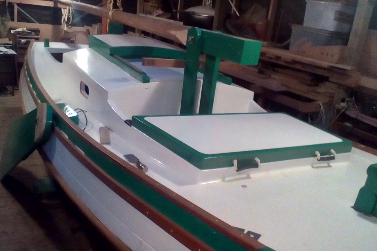 As you can see in the picture above, the ‘wings’ are placed on the sides and the mast is in place even though the boat is still in the boat shed (still negotiating the trailer aspects….). I like to think that I am not the least knowledgeable person around….. BBM said he was considering how best to fix the lea-boards since they will need to be raised and lowered when needed. I suggested rope, since hardware like screws would wear through the wood over time? It appears that was close, since in the picture BBM has positioned rubber tubing as a temporary way of judging how things could work.